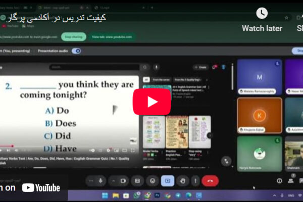 در این ویدئو زیبا از کلاس FR032، شاهد خلاقیت و ابتکار در تدریس و همچنین کیفیت فوق‌العاده کلاس‌های آکادمی پرگار خواهیم بود که به وضوح نمایانگر تلاش‌های ارزشمند آموزشی است. Code: FR032 Class: Q-Skills 2 Instructor: Mr. Shahnam Shukran Mentor: Narges Nabizada